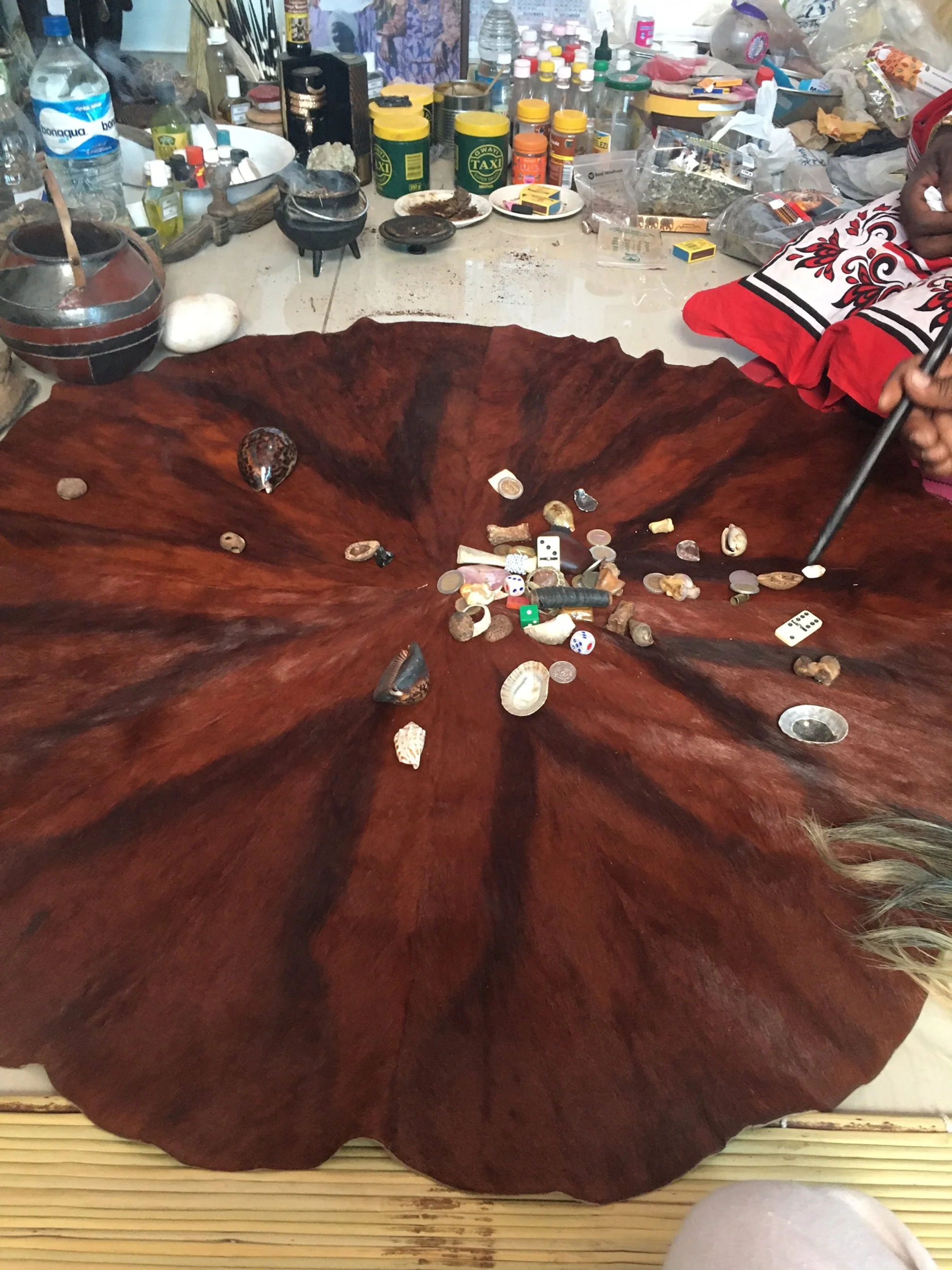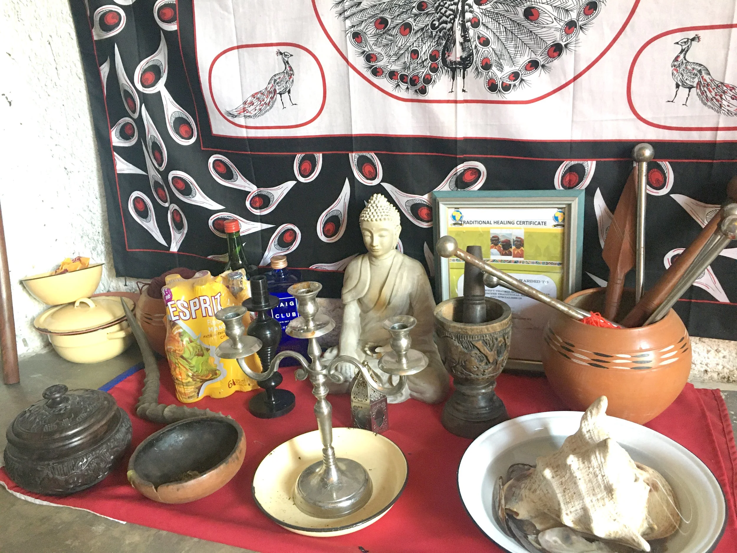 Shells are commonly used by sangomas as well as other types of spiritual healers, such as for example shamans, as Faith, a daughter of a Langa sangoma and a shaman in training explained to me.[4] They may be, more precisely, integrated into the shrines, comprising also other elements – statues, incense, water, candles, food offerings, perfumes, diplomas and certificates obtained, etc. – indexing local and global religious and cultural contexts, as well as the complex circulations of specialists, their disciples, patients, but also spirits. Thus, for example, it was explained to me by one of the sangomas born in Mozambique, whom I met in Katlehong township of Johannesburg, that whereas living plants crystalized the presence of the ancestors, and red beans that of the foreign Ndau spirits originating from Mozambique[5], the Buddha statues materialized Indian spirits probably present among her varied and partly unknown ancestors[6]. As spirits, the specialists also travel; some, such as the president of THO mentioned earlier, to India, for a joint workshop with Ayurveda specialists, others to Amazonia, to learn about ayahuasca, or to Namibia to visit some of their apprentices.