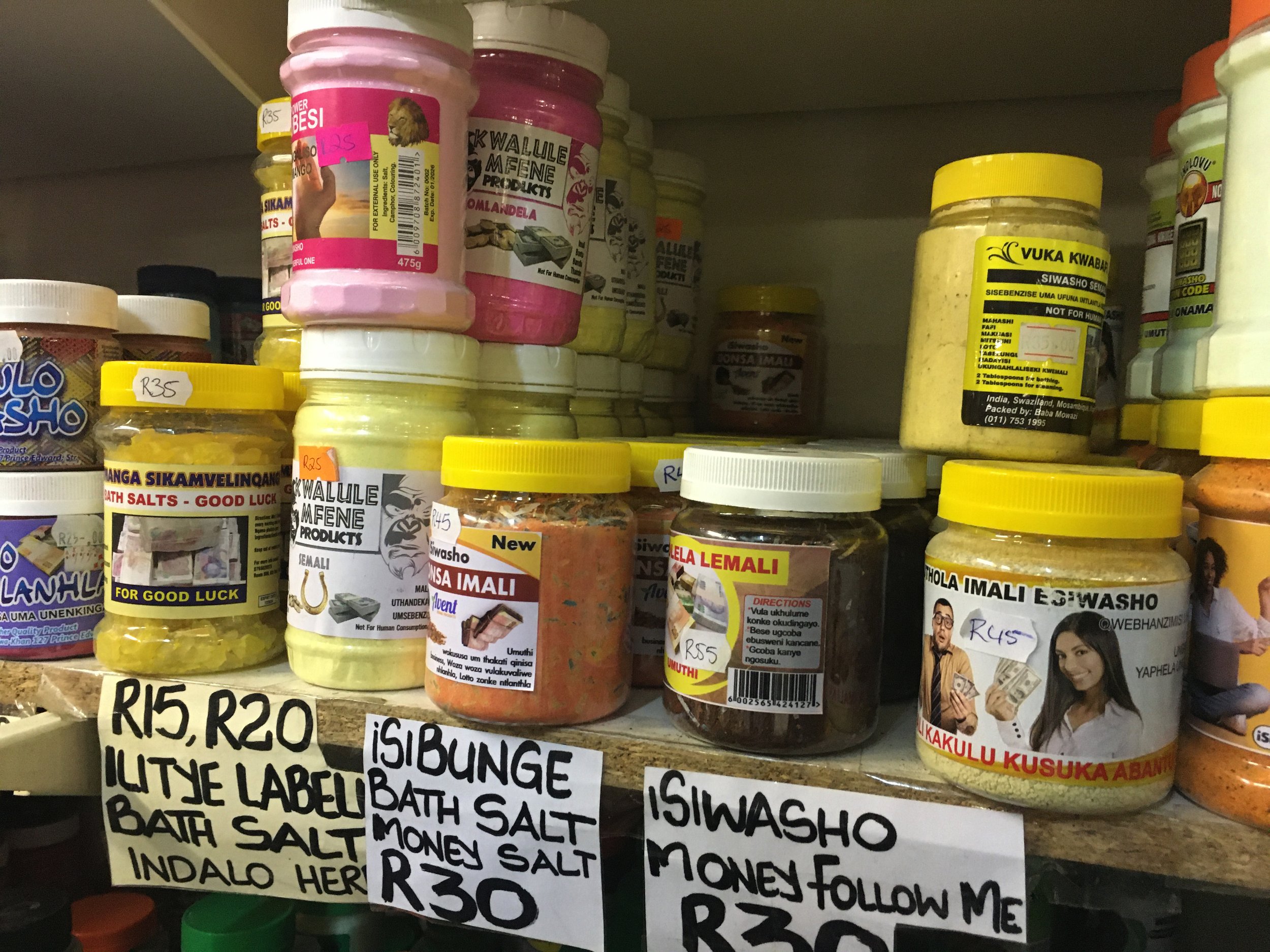 In the Langa pharmacy, most of the products on sale are made, I was assured, by South African companies from locally grown plants. Yet, those plants are not on sale in the form of fresh or dried roots, leaves or bulbs but rather vegetal – and no doubt other matters – powdered, liquefied, packed and transformed in novel ways. Tidily put on shelves in transparent plastic jars with labels, they look clean and professionally prepared, like biomedical products, even if their flashy colors and the labelling may seem unsettling, at least for my Western eye. Some of these products are supposed to help stop smoking or prevent mosquito bites, while others claim to bring good luck, solve money problems, and “fight back” evil spirits or witchcraft. If the raw materials are African and meant to answer local problems within the local etiologies, to do so, they assume new modernized forms of which the pictures on them are the emblems. They index, in fact, both, local traditions and global connections, indigenous knowledge and Western science, which they meld together, purposely cutting across color lines and racial distinctions through the montage of text, images, and material content forming a new whole. The outcome becomes somehow hybrid, complex, blurring the boundaries between ‘traditional’ and ‘modern’, “African” and “Western”, ‘natural’ and ‘industrial’.